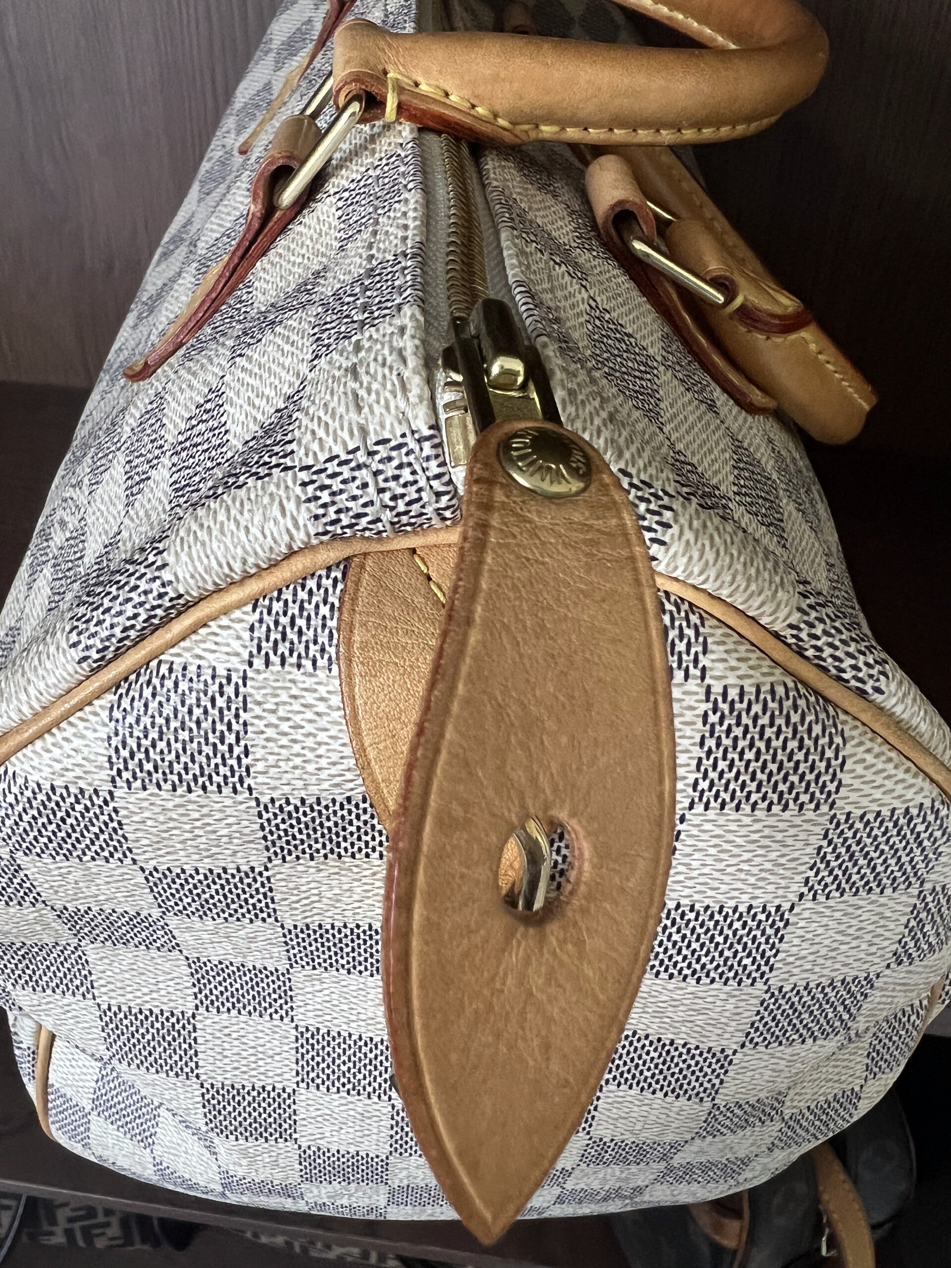 Material: Crafted from Louis Vuitton's signature Damier Azur canvas, this bag features a light blue and white checkerboard pattern, complemented by natural cowhide leather trim.